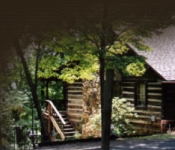 On a hill, there sits a pretty log cabin
